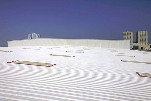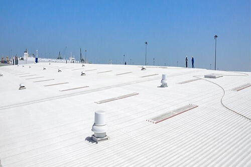 对屋面板整体喷涂两道MT表层涂料,使屋面形成一个弹性密封的无缝整体。